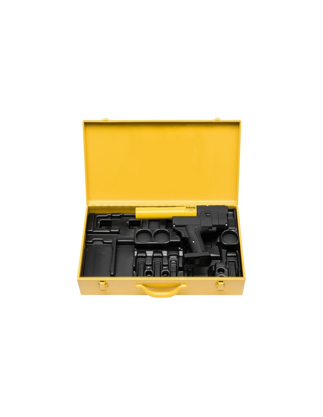 REMS Ax-Press 25 L 22 V ACC Basic-Pack. Pressatrice assiale a batteria per la realizzazione di connessioni a manicotto, diametro 12 - 40 mm. Corsa di 40 mm, per pressare connettori a manicotto con distanza di serraggio inferiore o uguale a 116 mm. Per l'azionamento di teste di pressatura REMS. Azionamento elettroidraulico con ritorno automatico, dotato di potente motore a batteria da 21,6 V, 380 W, robusto cambio planetario, pompa a pistone eccentrico e sistema idraulico ad alte prestazioni. Interruttore di sicurezza, dispositivo di pressatura girevole. Lampada da lavoro a LED. Senza batteria, senza caricatore rapido. Senza teste di pressatura. In robusta cassetta d'acciaio.