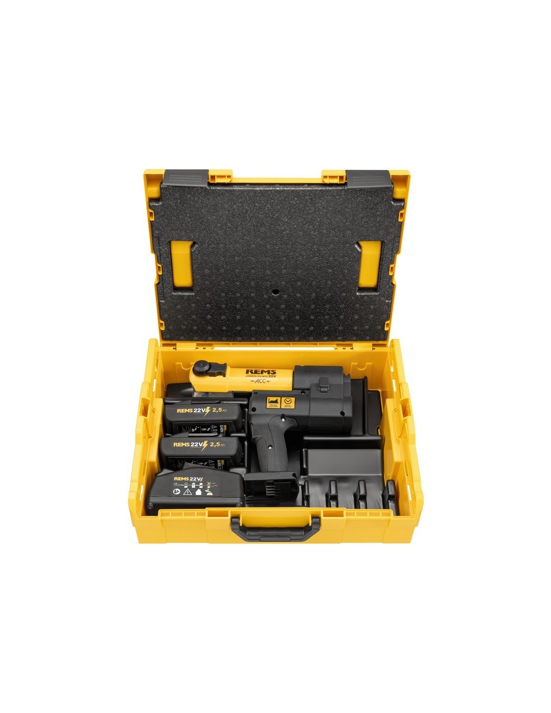 REMS Pressa a batteria 22V ACC Basic-Pack L-Boxx + Batteria 2,5 Ah, Pressa radiale a batteria da 32 kN con scarico forzato, monitoraggio della pressione di pressatura e visualizzazione dei risultati, per giunzioni a pressione da D 10-108 (110) mm, D 3/8-4". Pressa radiale a batteria universale e maneggevole da 32 kN con scarico forzato per la realizzazione di giunzioni a pressione per tutti i comuni sistemi di raccordo a pressione. Adatta per l'azionamento di pinze/fermi di pressatura REMS e per pinze/fermi di pressatura compatibili di altri marchi. Compatta, maneggevole e super leggera. Pesa solo 3,3 kg (con batteria). La macchina azionante con pinza di pressatura V 15 è lunga solo 35,5 cm. Ottimale distribuzione del peso per un'operazione a una mano. La macchina azionante con la pinza di pressatura inserita può essere appoggiata in modo sicuro sulla batteria. Design ergonomico della scocca e superfici di presa con Softgrip. Sensore di pressione elettronico per il monitoraggio della forza di spinta, valutazione della pressione di pressatura tramite visualizzazione dei risultati con LED bicolore bianco/rosso. Luce di lavoro a LED. Controllo dello stato della macchina. Supporto per pinze di pressatura rotante >360 gradi. Saldatura sicura della pinza di pressatura/pinza intermedia grazie al bloccaggio automatico. Processo di pressatura in modalità a impulso con ACC. Ritorno automatico dopo il completamento del processo di pressatura (scarico forzato). Forza di spinta e pressatura tonnellate per pressature rapide e perfette in pochi secondi. Forza di spinta 32 kN. Potente azionamento elettroidraulico con potente motore a batteria da 21,6 V, 380 W. Interruttore di sicurezza. Tecnologia Li-Ion 22 V. Batterie Li-Ion ad alta capacità da 21,6 V con capacità di 2,5, 4,4, 5,0 o 9,0 Ah, per lunga durata. Leggera e potente. Batteria Li-Ion 21,6 V, 2,5 Ah, per circa 200 pressature Viega Profipress DN 15 con una carica della batteria. Indicazione dello stato di carica a livelli tramite LED colorati. Caricabatterie rapido da 90 W per tempi di ricarica molto brevi. Per funzionamento a batteria e a rete. Alimentazione 220-240 V / 21,6 V in sostituzione della batteria. Prodotto di qualità tedesca. Contenuto della fornitura: macchina azionante, batteria Li-Ion 21,6 V, 2,5 Ah, caricabatterie rapido 100-240 V, 90 W, nella robusta cassetta L-Boxx. + 2. Batteria Li-Ion 21,6 V, 2,5 Ah.