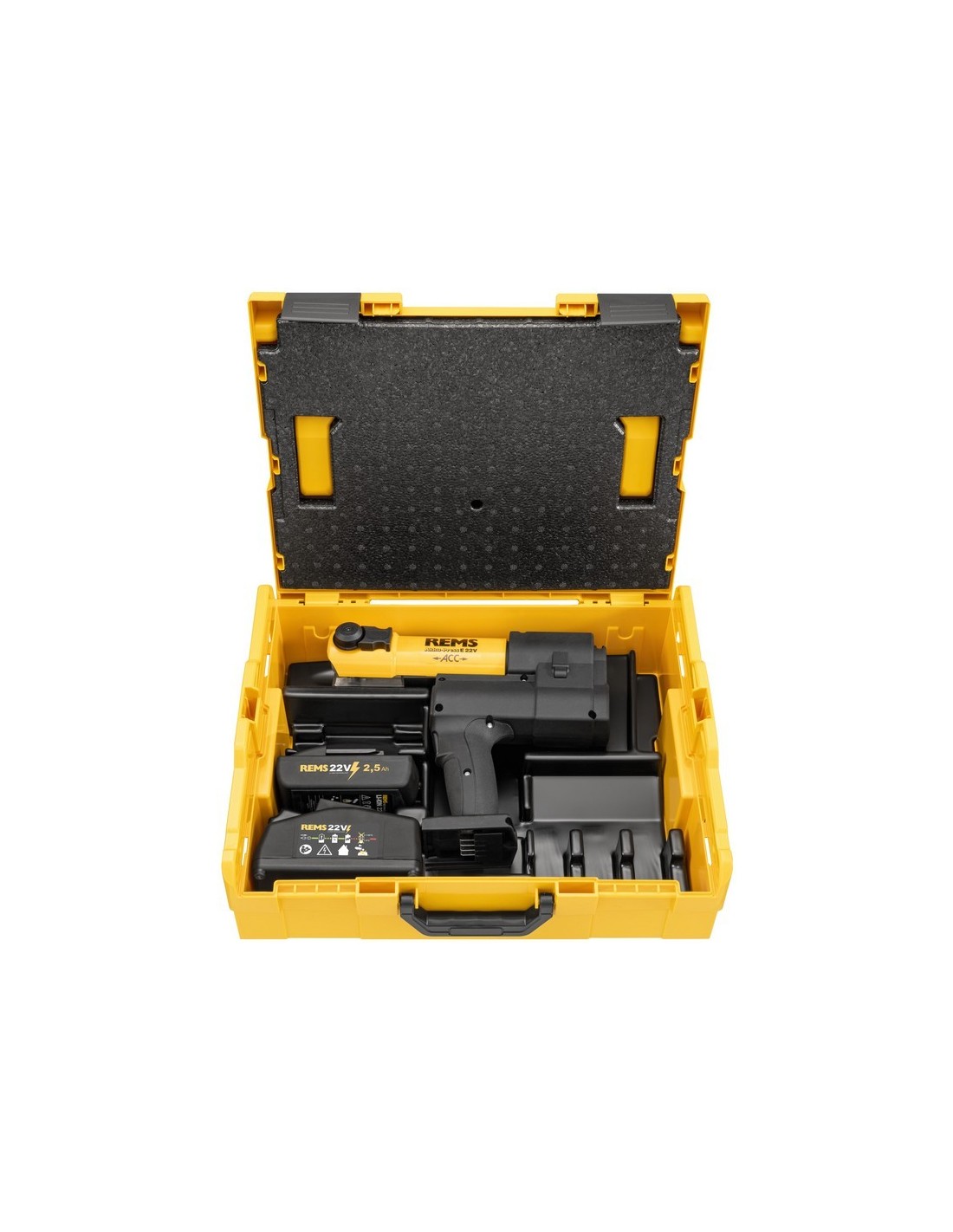 REMS Pressa a batteria E 22V ACC Basic-Pack, Pressa radiale a batteria da 32 kN con scarico forzato, per giunzioni a pressione da D 10-108 (110) mm, D 3/8-4". Pressa radiale a batteria universale e maneggevole da 32 kN con scarico forzato per la realizzazione di giunzioni a pressione per tutti i comuni sistemi di raccordo a pressione. Adatta per l'azionamento di pinze/fermi di pressatura REMS e per pinze/fermi di pressatura compatibili di altri marchi. Compatta, maneggevole e super leggera. Pesa solo 3,3 kg (con batteria). La macchina azionante con pinza di pressatura V 15 è lunga solo 35,5 cm. Ottimale distribuzione del peso per un'operazione a una mano. La macchina azionante con la pinza di pressatura inserita può essere appoggiata in modo sicuro sulla batteria. Design ergonomico della scocca e superfici di presa con Softgrip. Luce di lavoro a LED. Controllo dello stato della macchina. Supporto per pinze di pressatura rotante >360 gradi. Saldatura sicura della pinza di pressatura/pinza intermedia grazie al bloccaggio automatico. Processo di pressatura in modalità a impulso con ACC. Ritorno automatico dopo il completamento del processo di pressatura (scarico forzato). Forza di spinta e pressatura tonnellate per pressature rapide e perfette in pochi secondi. Forza di spinta 32 kN. Potente azionamento elettroidraulico con potente motore a batteria da 21,6 V, 380 W. Interruttore di sicurezza. Tecnologia Li-Ion 22 V. Batterie Li-Ion ad alta capacità da 21,6 V con capacità di 2,5, 4,4, 5,0 o 9,0 Ah, per lunga durata. Leggera e potente. Batteria Li-Ion 21,6 V, 2,5 Ah, per circa 200 pressature Viega Profipress DN 15 con una carica della batteria. Indicazione dello stato di carica a livelli tramite LED colorati. Per funzionamento a batteria e a rete. Alimentazione 220-240 V / 21,6 V in sostituzione della batteria. Prodotto di qualità tedesca. Contenuto della fornitura: macchina azionante, batteria 21,6 V, 2,5 Ah, caricabatterie rapido 100-240 V, 70 W, nella cassetta L-Boxx.