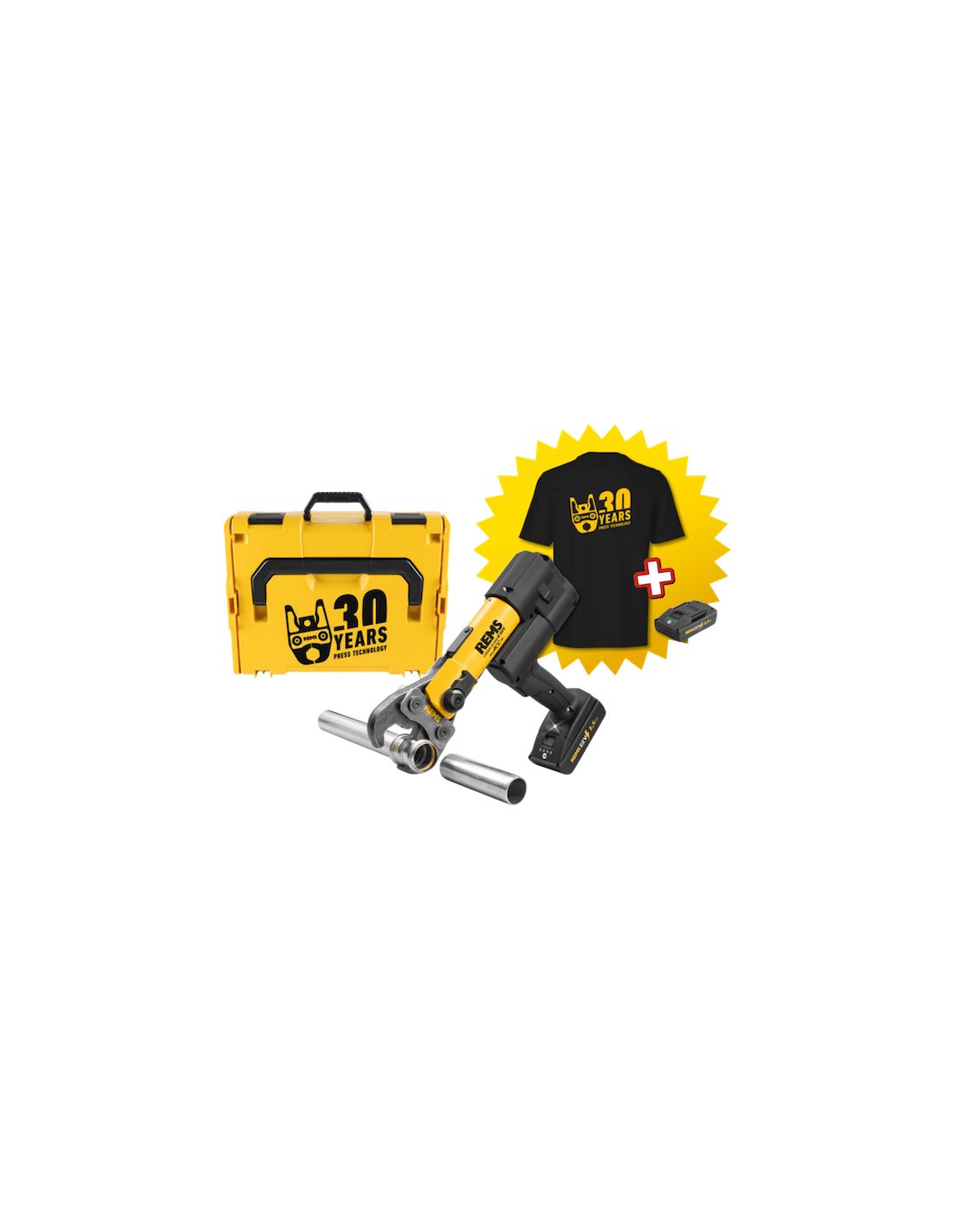 Pressa radiale a batteria con scarico forzato e monitoraggio della pressione di pressatura, per la realizzazione di giunzioni a pressione a seconda del sistema, con diametri da 10 a 108 (110) mm, e da 3/8 a 4". Adatta per l'azionamento di pinze/fermi di pressatura REMS e di pinze/fermi di pressatura compatibili di altri marchi. Supporto per pinze di pressatura rotante con bloccaggio automatico. Azionamento elettroidraulico con potente motore a batteria da 21,6 V, 380 W, robusto riduttore planetario, pompa a pistone eccentrico e sistema idraulico ad alte prestazioni compatto. Sistema anti-vibrazioni. Interruttore di sicurezza. Luce di lavoro a LED. In robusta cassetta in lamiera.