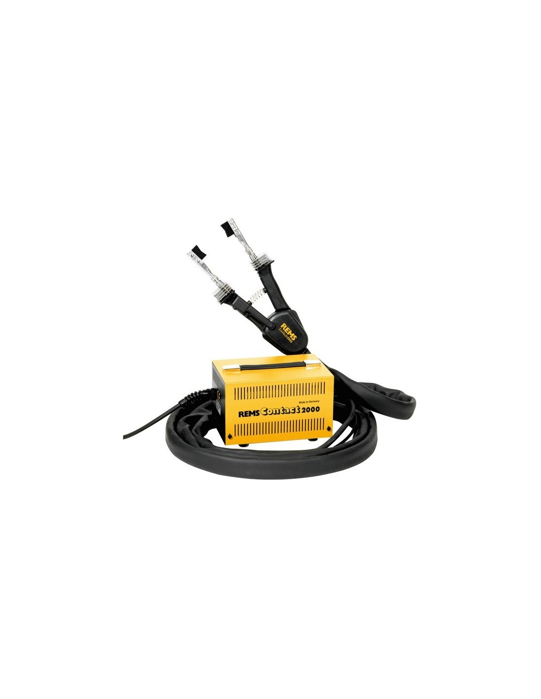 Dispositivo di saldatura elettrico per la saldatura a stagno di tubi di rame con diametro da 6 a 54 mm, da 1/4 a 2 1/8 pollici. 230 V, 50 - 60 Hz, 2000 W, tensione di controllo 24 V. Pinza per saldatura con cavi di 4 m di lunghezza, trasformatore di sicurezza, 2 elettrodi prismatici. Fornito in scatola.