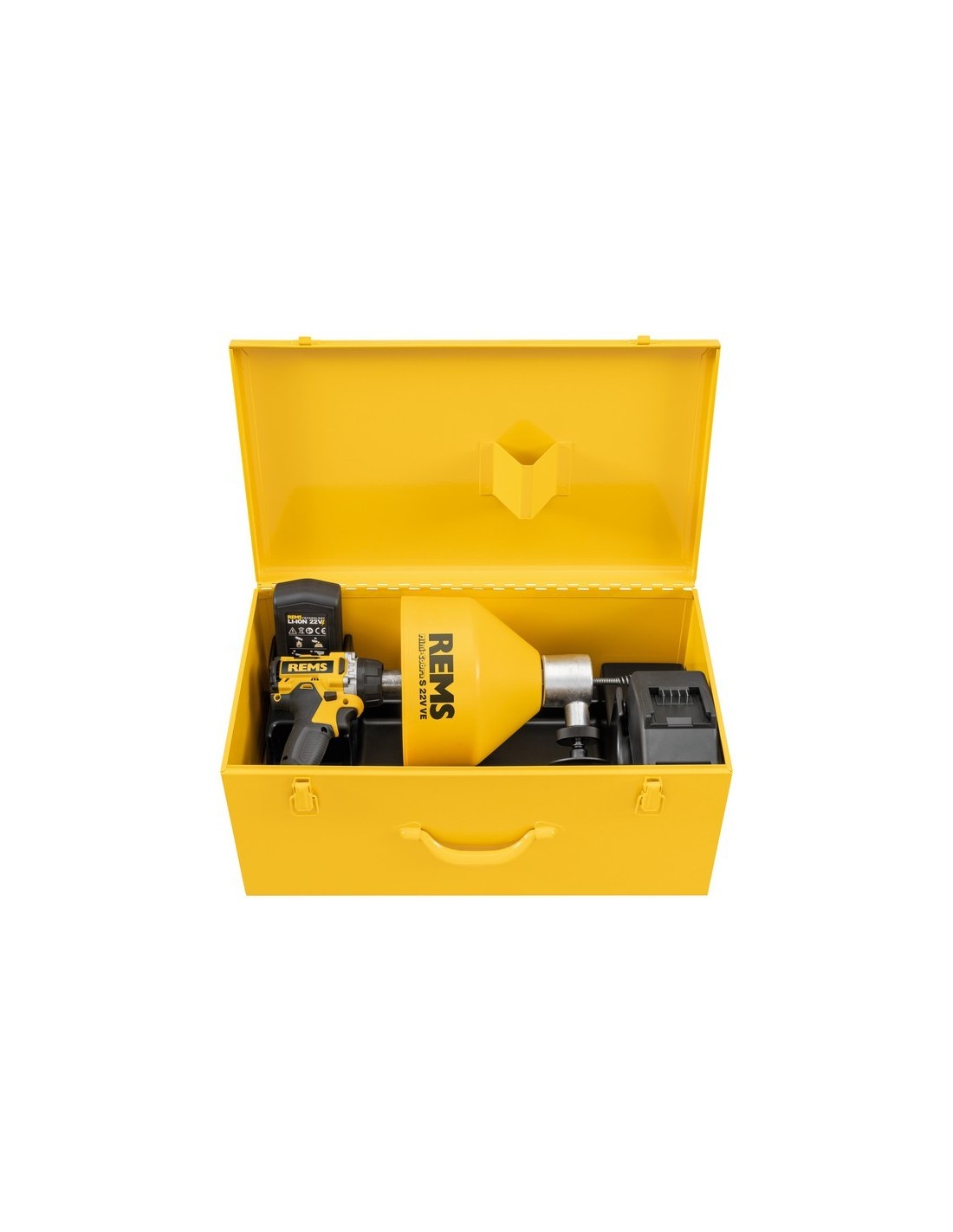 REMS Mini-Cobra S 22V VE. Dispositivo elettrico per la pulizia dei tubi con cambio rapido, per tubi con diametro da 20 a 50 (75) mm. Compatibile con spirali di pulizia dei tubi con diametro di 8 e 10 mm. Macchina motrice dotata di un potente motore a batteria senza spazzole da 21,6 V e 500 W, ingranaggio robusto e senza manutenzione, coppia di torsione particolarmente elevata per rotazione a destra e a sinistra a basse velocità, interruttore di sicurezza a pulsante. Regolazione elettronica continua della velocità (interruttore a gas (VE)) da 0 a 560 giri/min. Batteria Li-Ion 21,6 V, 2,5 Ah, caricabatterie rapido 220-240 V, 50-60 Hz, 70 W. Tamburo per spirali in plastica rinforzata con fibra di vetro, resistente agli urti. Spirale con diametro di 8 mm, con anima, lunga 7,5 m. Fornito in un robusto contenitore in acciaio.