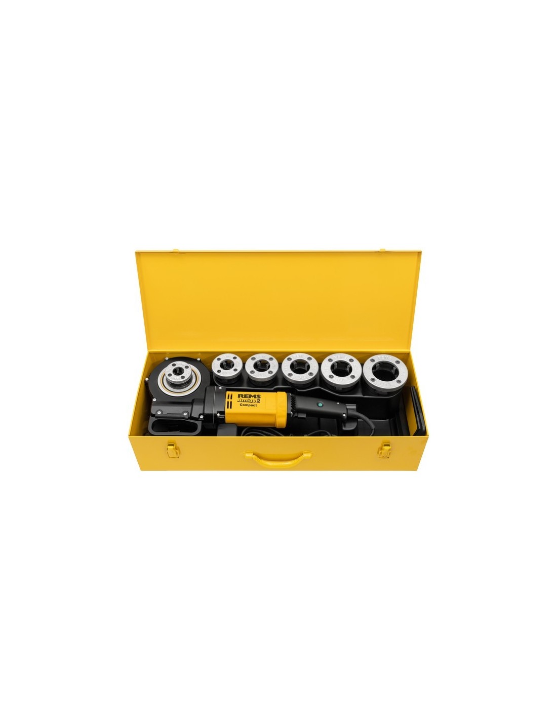 REMS Amigo 2 Compact Set: filettatrice elettrica con teste di taglio a cambio rapido, per filettature di tubi da 1/8" a 2" (16 - 50 mm) e bulloni da 6 a 30 mm, motore universale 230 V, 50 - 60 Hz, 1200 W, ingranaggio esente da manutenzione, interruttore di sicurezza, regolazione automatica delle spazzole, potenza massima in uscita fino a 1800 W, rotazione in entrambe le direzioni, protezione da sovraccarico, abstützbügel per sostenere la macchina, teste di taglio REMS eva per filettature coniche ISO 7-1 e filettature per tubi elettrici EN 60423 M, fornita in cassetta in acciaio.