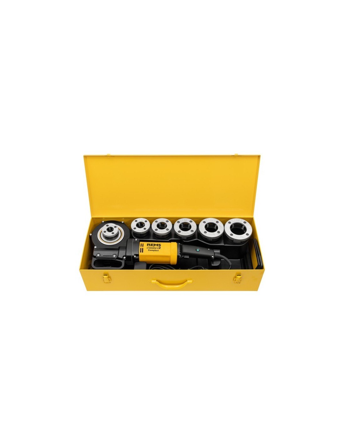 REMS Amigo 2 Compact Set: filettatrice elettrica con teste di taglio a cambio rapido, adatta per filettature di tubi da 1/8" a 2" (16 - 50 mm) e filettature di bulloni da 6 a 30 mm, motore universale potente da 1200 W, funzionante a 230 V, 50 - 60 Hz, ingranaggio senza manutenzione, interruttore di sicurezza, regolazione automatica delle spazzole per il miglioramento delle prestazioni in base alla direzione di rotazione. Supporto per entrambe le direzioni di rotazione, protezione da sovraccarico. Include teste di taglio REMS eva per filettature coniche ISO 7-1 e filettature per tubi elettrici EN 60423 M, fornita in una robusta cassetta in acciaio.
