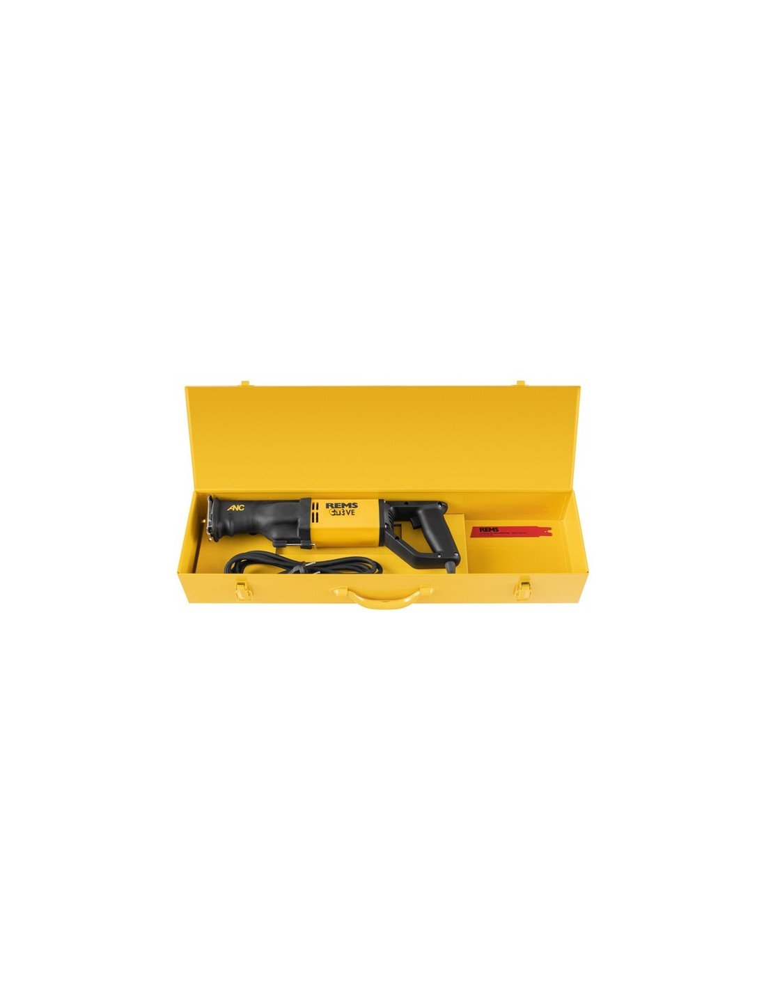 Segatrice universale elettrica con elettronica Vario (VE) per segare a mano libera. Macchina con impugnatura a pala, azionamento oscillante senza manutenzione, protetto da acqua e polvere, con trasmissione a manovella completamente cuscinetti a aghi (ANC), corsa orbitale aggressiva, potente motore universale da 230 V, 50 - 60 Hz, 1050 W, interruttore di sicurezza. Regolazione elettronica continua della frequenza di corsa (interruttore a gas) da 0 a 2400 min⁻¹. Attacco per lama universale. Chiave a esagono. 1 pezzo di lama universale REMS 150-1,8/2,5. In una robusta cassetta in lamiera.