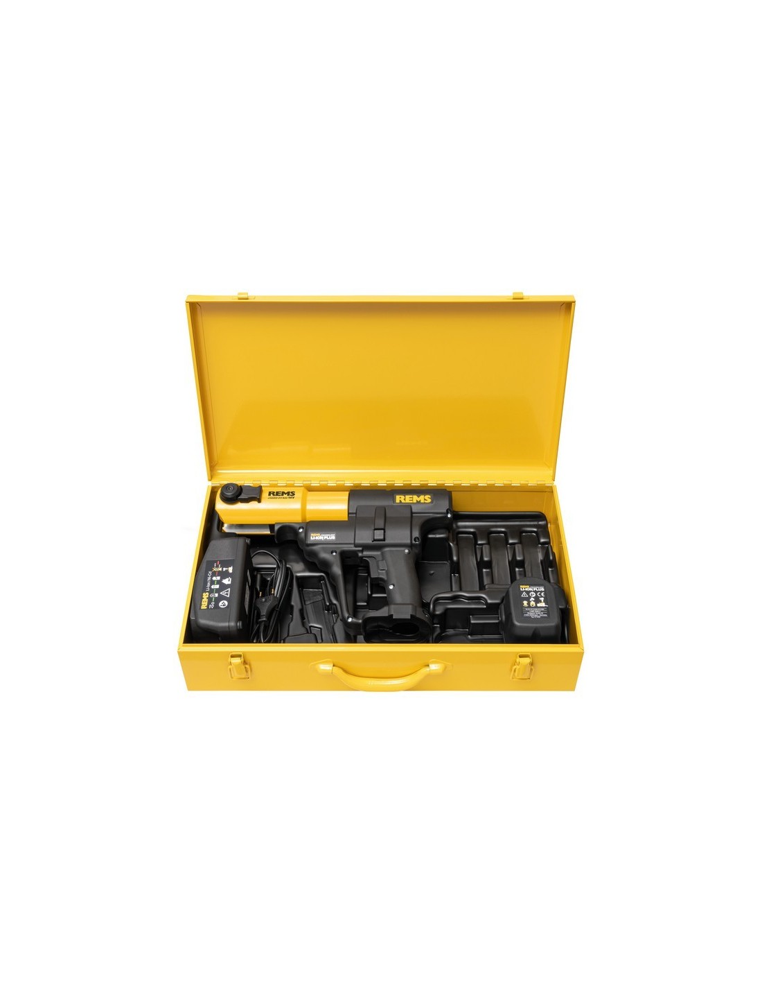 Pressa radiale a batteria con segnale di arresto per la realizzazione di connessioni a pressione, a seconda del sistema, da Dm. 10 a 108 (110) mm, Dm. 3/8 - 4". Per l'azionamento delle ganasce/ringhiere REMS e di ganasce/ringhiere compatibili di altri marchi. Attacco per ganasce rotabile con bloccaggio automatico. Azionamento elettroidraulico con potente motore a batteria da 14,4 V, 380 W, robusto riduttore planetario, pompa a pistone eccentrico e compatto sistema idraulico ad alte prestazioni, interruttore di sicurezza. Luce di lavoro LED integrata. Batteria Li-Ion da 14,4 V, 5,0 Ah, caricatore rapido Li-Ion/Ni-Cd 230 V, 50 - 60 Hz, 65 W. In una robusta cassetta in lamiera.