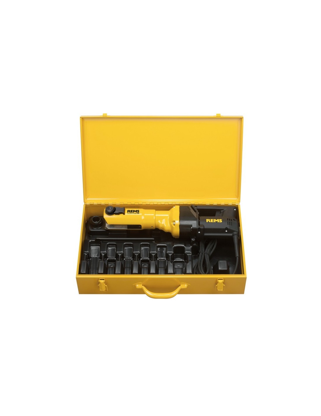 Pressa radiale elettrica per la realizzazione di connessioni a pressione, a seconda del sistema, da Dm. 10 a 108 (110) mm, Dm. 3/8 - 4". Per l'azionamento delle ganasce/ringhiere REMS e di ganasce/ringhiere compatibili di altri marchi. Attacco per ganasce con bloccaggio automatico. Azionamento elettromeccanico con collaudato motore universale da 230 V, 50 - 60 Hz, 450 W, riduttore privo di manutenzione con frizione di sicurezza e sistema di avanzamento con vite trapezoidale, protezione contro il sovraccarico, interruttore di sicurezza. In una robusta cassetta in lamiera.