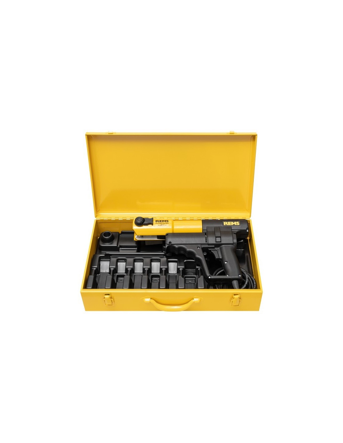 Pressa radiale elettroidraulica con scarico forzato per la realizzazione di giunzioni a pressione, a seconda del sistema, da Dm. 10 - 108 (110) mm, Dm. 3/8 - 4". Adatta per l'azionamento di pinze/fermi di pressatura REMS e di pinze/fermi di pressatura compatibili di altri marchi. Supporto per pinze di pressatura rotante con bloccaggio automatico. Azionamento elettroidraulico con motore universale collaudato da 230 V, 50 - 60 Hz, 450 W, robusto riduttore planetario, pompa a pistone eccentrico e compatto sistema idraulico ad alte prestazioni, interruttore di sicurezza. Fornito in una robusta cassetta in lamiera.