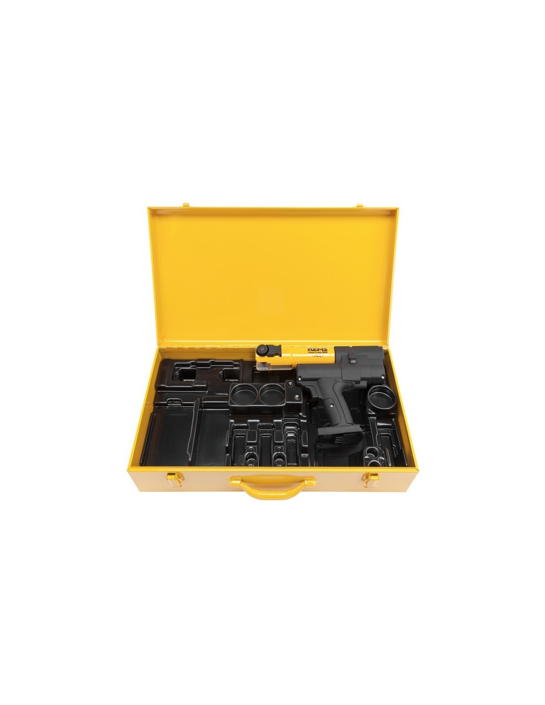 Pressatrice radiale a batteria con ciclo forzato per la realizzazione di connessioni pressfitting Dm. 10 - 40 mm, Dm. 3/8 - 1 1/4". Compatibile con ganasce per pressare e anelli REMS Mini. Supporto ganasce rotante con blocco automatico. Azionamento elettroidraulico con motore a batteria potente da 21,6 V, 380 W, robusto ingranaggio planetario, pompa a pistone eccentrico e sistema idraulico compatto ad alte prestazioni, interruttore di sicurezza a scatto. Dotata di luce di lavoro LED integrata. In una robusta cassetta in acciaio.