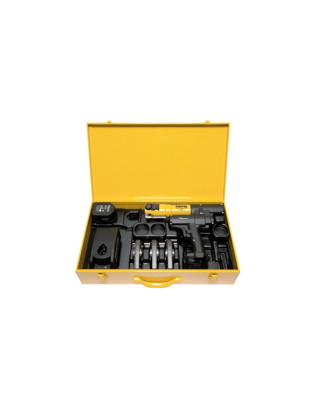 Ganasce per pressare REMS Mini con 2 ganasce monoblocco orientabili. Design particolarmente compatto e peso ridotto delle ganasce REMS Mini grazie a una speciale disposizione del collegamento delle ganasce (brevetto EP 1 952 948). Cavità integrate nelle ganasce per una guida sicura delle linguette di connessione, che garantiscono una pressatura senza disallineamenti (brevetto EP 2 347 862). In una robusta cassetta in acciaio.