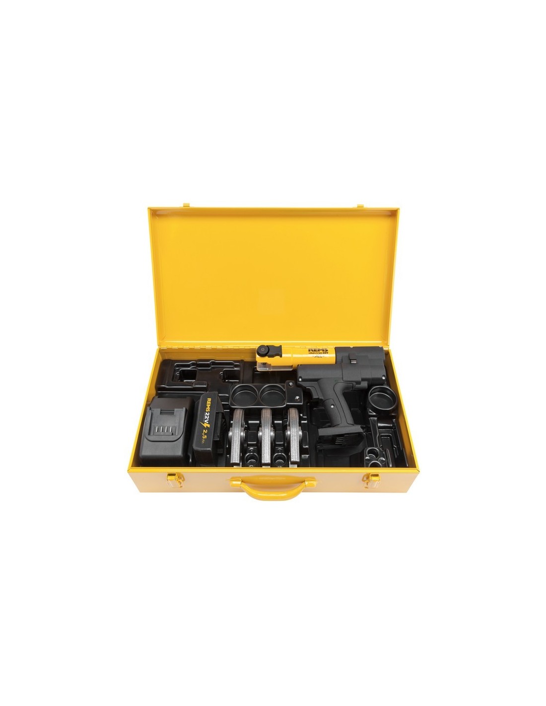 Pressatrice radiale a batteria con ciclo forzato per la realizzazione di connessioni pressfitting Dm. 10 - 40 mm, Dm. 3/8 - 1 1/4". Progettata per l'uso con ganasce per pressare e anelli REMS Mini. Supporto per ganasce rotante con blocco automatico. Azionamento elettroidraulico con potente motore a batteria da 21,6 V, 380 W, ingranaggio planetario robusto, pompa a pistone eccentrico e sistema idraulico compatto ad alte prestazioni, interruttore di sicurezza a scatto. Dotata di luce di lavoro LED integrata. Batteria Li-Ion 21,6 V, 1,5 Ah, caricabatterie rapido Li-Ion 230 V, 50 - 60 Hz, 70 W. Include ganasce Mini. In una robusta cassetta in acciaio.