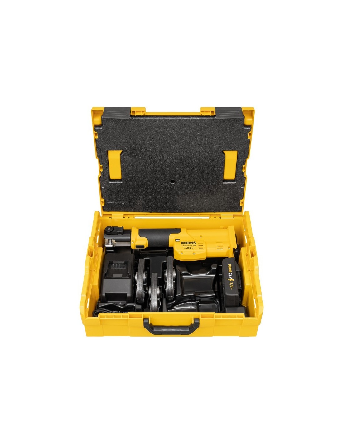 Pressa radiale a batteria con scarico forzato per la produzione di giunti a pressione con diametro da 10 a 40 mm, da 3/8 a 1 1/4". Per l'azionamento di ganasce di pressatura Mini/anelle di pressatura REMS. Supporto per ganasce di pressatura girevole con bloccaggio automatico. Azionamento elettroidraulico con potente motore a batteria da 21,6 V, 380 W, robusto riduttore planetario, pompa a pistone eccentrico e sistema idraulico compatto ad alte prestazioni, interruttore di sicurezza. Luce di lavoro a LED integrata. Batteria Li-Ion da 21,6 V, 1,5 Ah, caricabatterie rapido Li-Ion 230 V, 50 - 60 Hz, 70 W. Inclusi ganasce di pressatura Mini. In una cassetta di sistema L-Boxx.