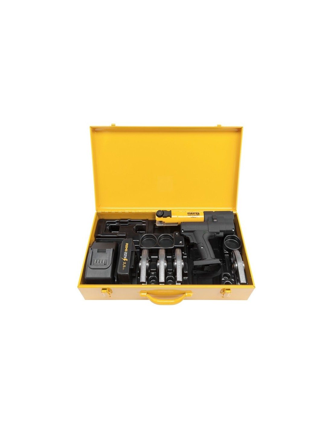 Pressatrice radiale a batteria con ciclo forzato per la realizzazione di connessioni pressfitting Dm. 10 - 40 mm, Dm. 3/8 - 1 1/4". Compatibile con ganasce per pressare e anelli REMS Mini. Supporto ganasce rotante con blocco automatico. Azionamento elettroidraulico con potente motore a batteria da 21,6 V, 380 W, robusto ingranaggio planetario, pompa a pistone eccentrico e sistema idraulico compatto ad alte prestazioni, interruttore di sicurezza a scatto. Dotata di luce di lavoro LED integrata. Batteria Li-Ion 21,6 V, 1,5 Ah, caricabatterie rapido Li-Ion 230 V, 50 - 60 Hz, 70 W. Inclusa con ganasce Mini. In una robusta cassetta in acciaio.