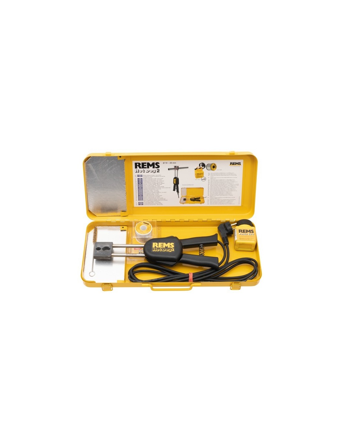 REMS Hot Dog 2 Set. Pinza elettrica per saldatura a stagno di tubi di rame con diametro da 10 a 28 mm, 3/8 - 1 1/8. 230 V, 50 - 60 Hz, 440 W. Include 250 g di REMS Stagno Cu 3 e REMS Pasta Cu 3. Spazzola di pulizia. Fornito in una cassetta in lamiera d'acciaio con inserto ignifugo.