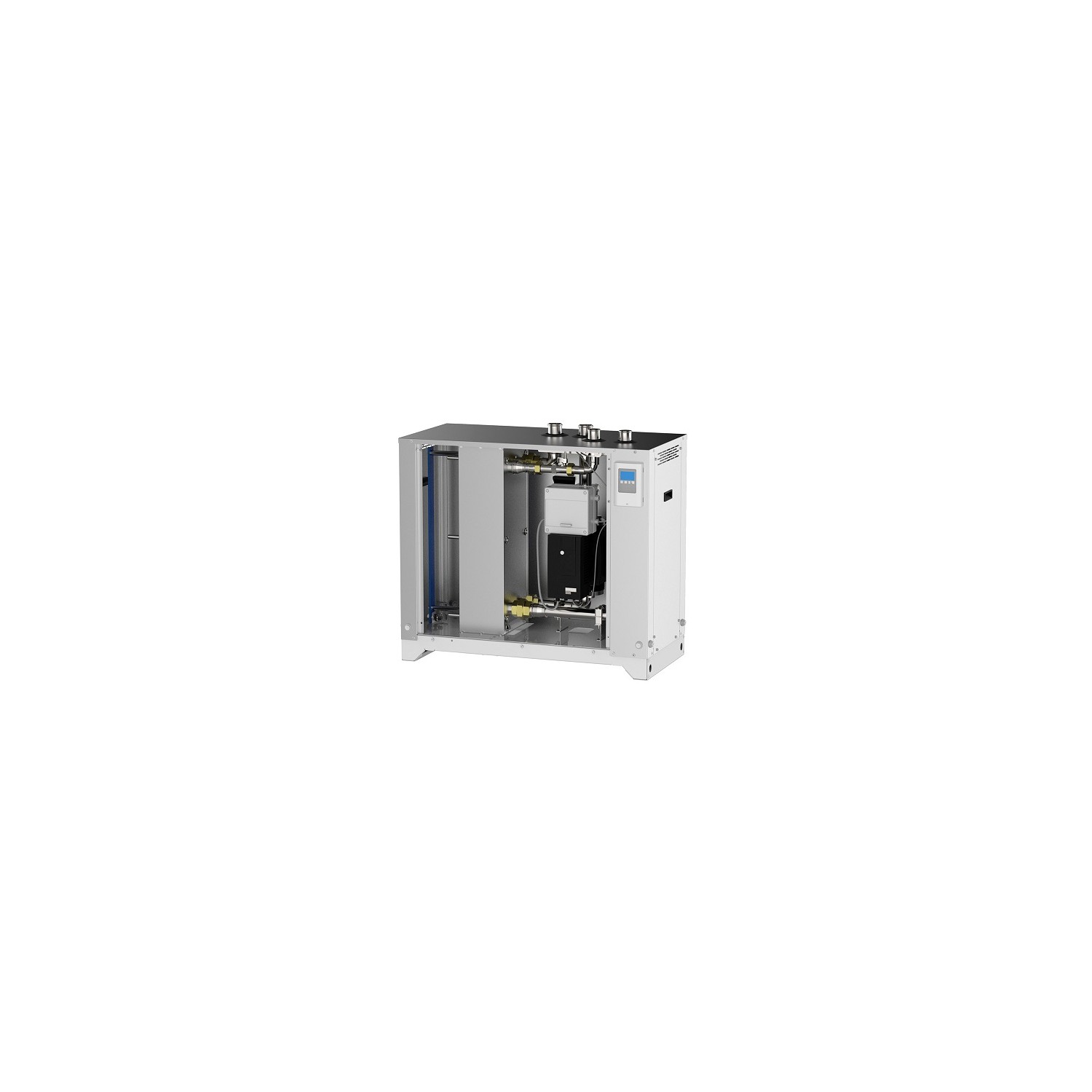 Il set è composto da centralina di regolazione, circolatore ad alta efficienza, scambiatore di calore in acciaio inox 316, pannellature e basamento in acciaio zincato e verniciato.